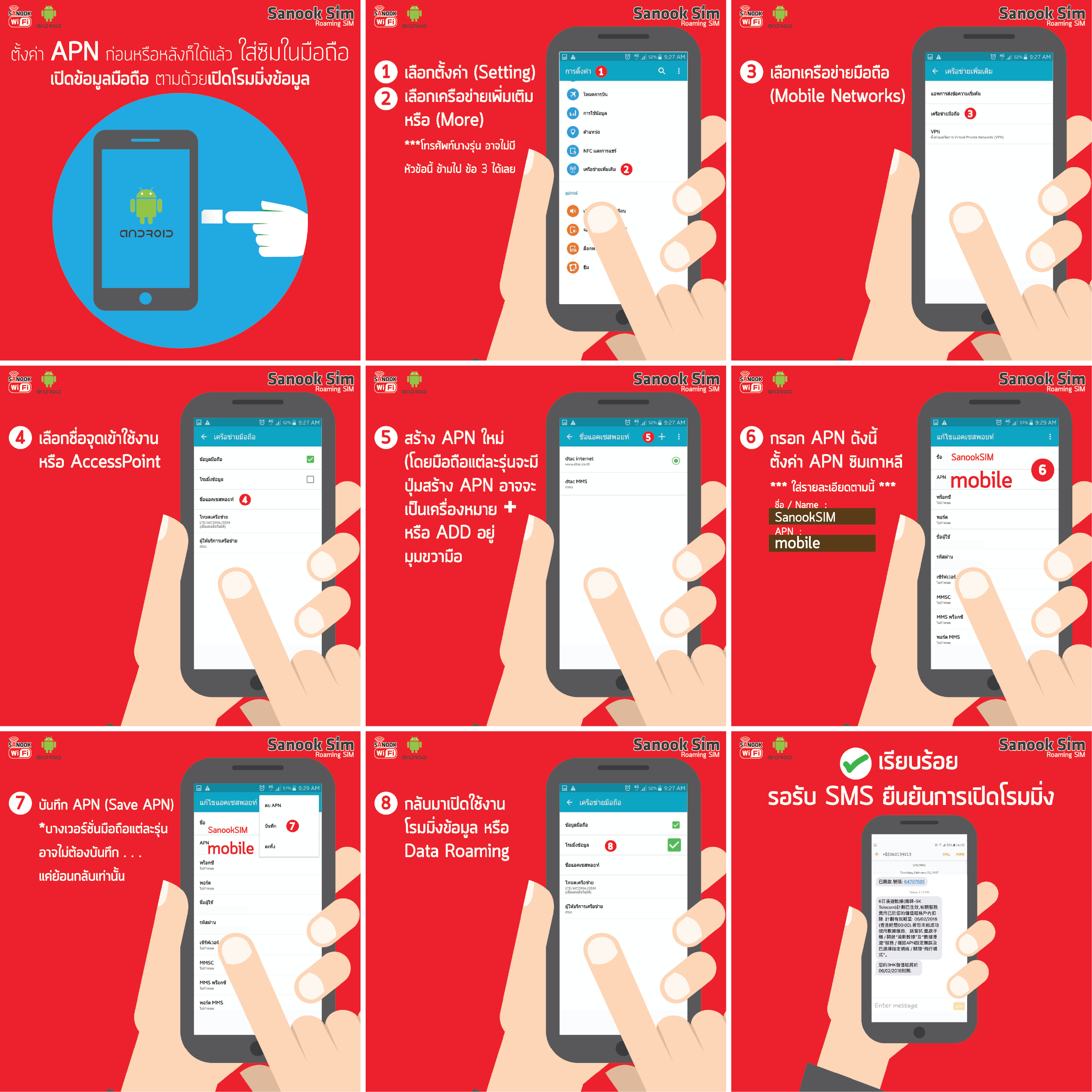 สำหรับผู้ใช้ระบบ Android เมื่อใส่ซิมในมือถือเรียบร้อยแล้ว ปิด WiFi เปิดข้อมูลมือถือ เปิด “ดาต้าโรมมิ่ง“ ซิมจะ Auto Activated และใช้เล่นอินเตอร์เน็ตได้ทันที หากใช้ไม่ได้ ให้ตั้งค่า APN